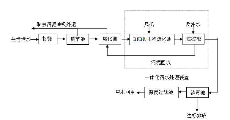 污水經(jīng)格柵后進入調(diào)節(jié)池,進行水力水量調(diào)節(jié),之后進入酸化池酸化(兼有沉淀作用),然后進入BFBR生物流化池進行生物降解及氧化處理,并經(jīng)過濾池過濾,再經(jīng)過加氯消毒,即可達標排放,若再經(jīng)過深度過濾處理,即可作中水回用。
