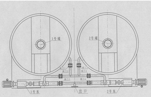 螺桿泵由六個(gè)球閥實(shí)現(xiàn)1#、2#攪拌罐和1#、2#螺桿泵互通。